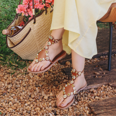 O modelo traz cobertura parcial do peito do pé, com amarração no tornozelo, estilo gladiadora, um mix de metais ABS em esferas e moedas orgânicas que adiciona um charme moderno e elegante. A rasteira combina com tudo e garante estilo e conforto para os looks da temporada.. Especialmente quando o assunto é praticidade. E elas são as aliadas perfeitas no seu dia-a-dia. Incríveis para eventos no final da tarde e até à noite. Também super match para o trabalho, basta combinar com peças mais sofisticadas.